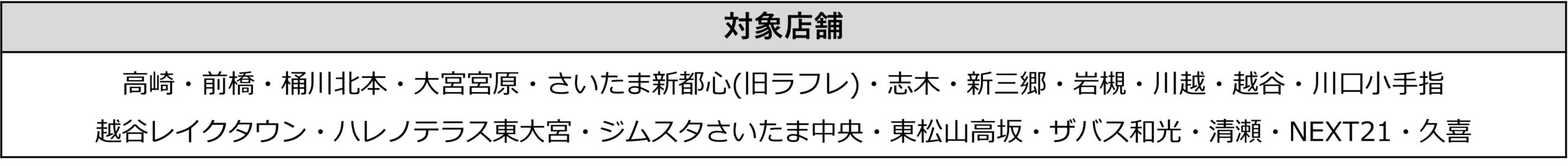 高崎・前橋・桶川北本・大宮宮原・さいたま新都心(旧ラフレ)・志木・新三郷・岩槻・川越・越谷・川口・小手指・越谷レイクタウン・ハレノテラス東大宮・ジムスタさいたま中央・東松山高坂・ザバス和光・清瀬・NEXT21・久喜