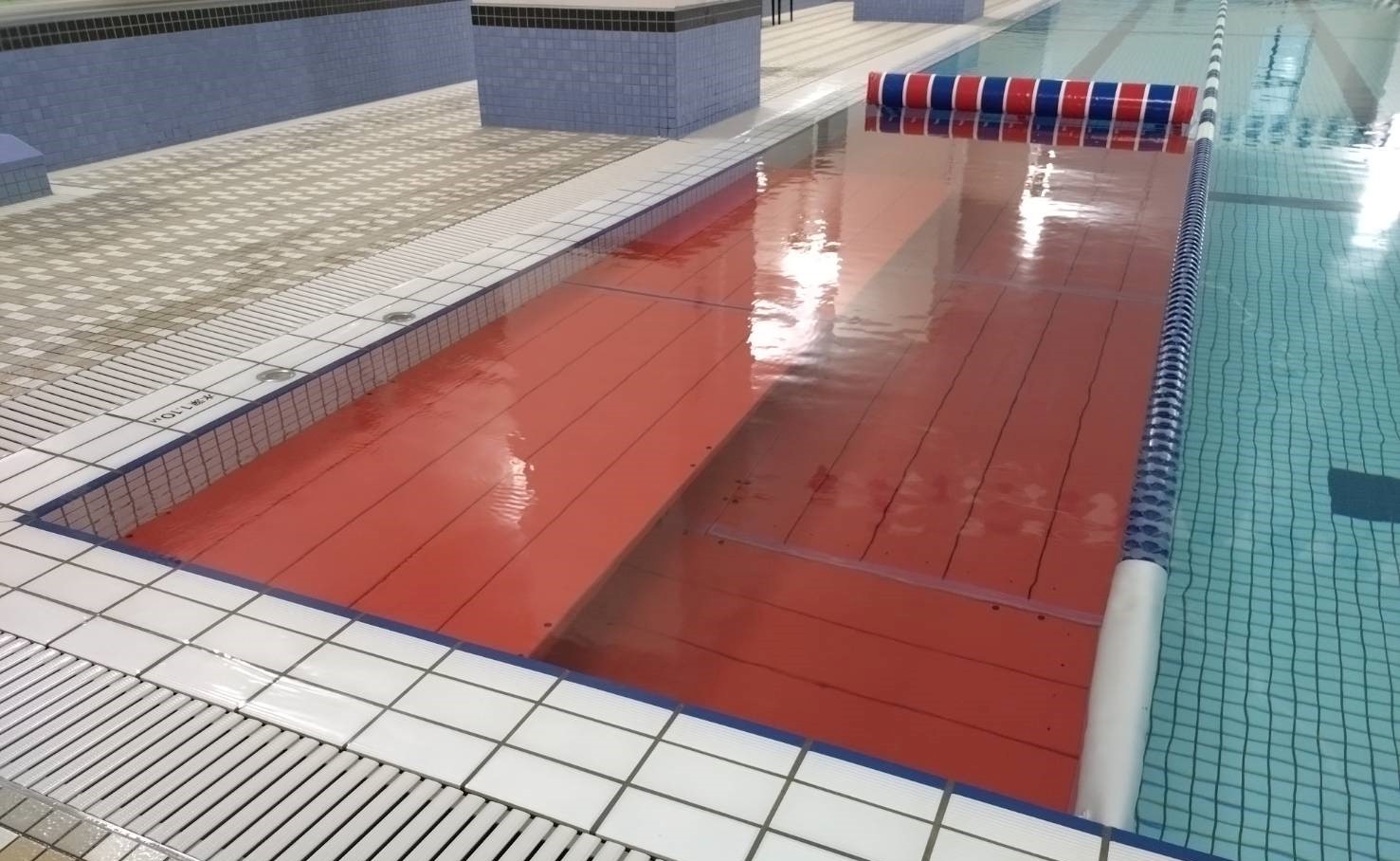 【スイミングスクール実施イメージ】赤台を設置して安全指導をしています。