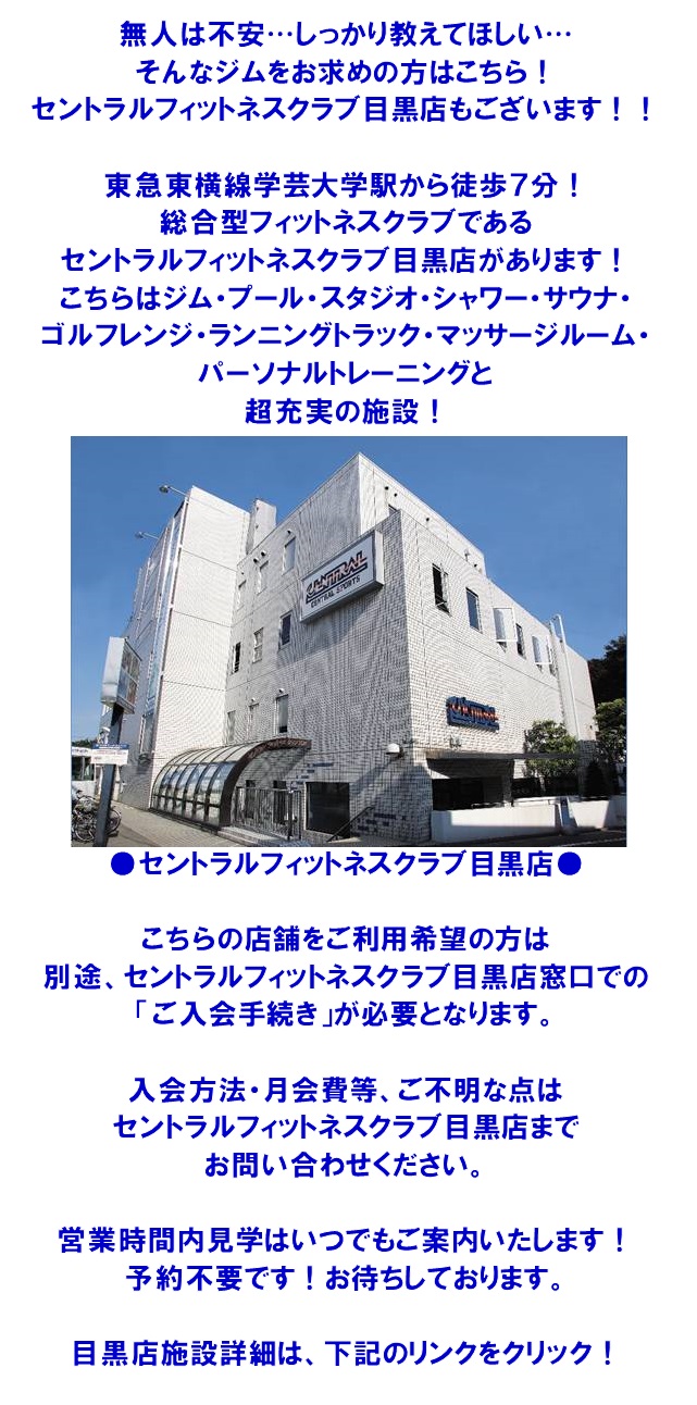 【無人は不安…はじめはしっかり教えてほしい…】そんなジムをお求めの方はこちら!隣り駅の学芸大学駅徒歩7分!セントラルフィットネスクラブ目黒店もございます!!