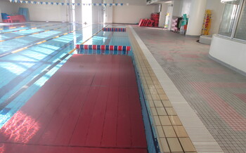 プール(スイミングスクール使用時) 初級クラスでは赤い台を設置し、お子様でも足がつく深さで練習を行います。