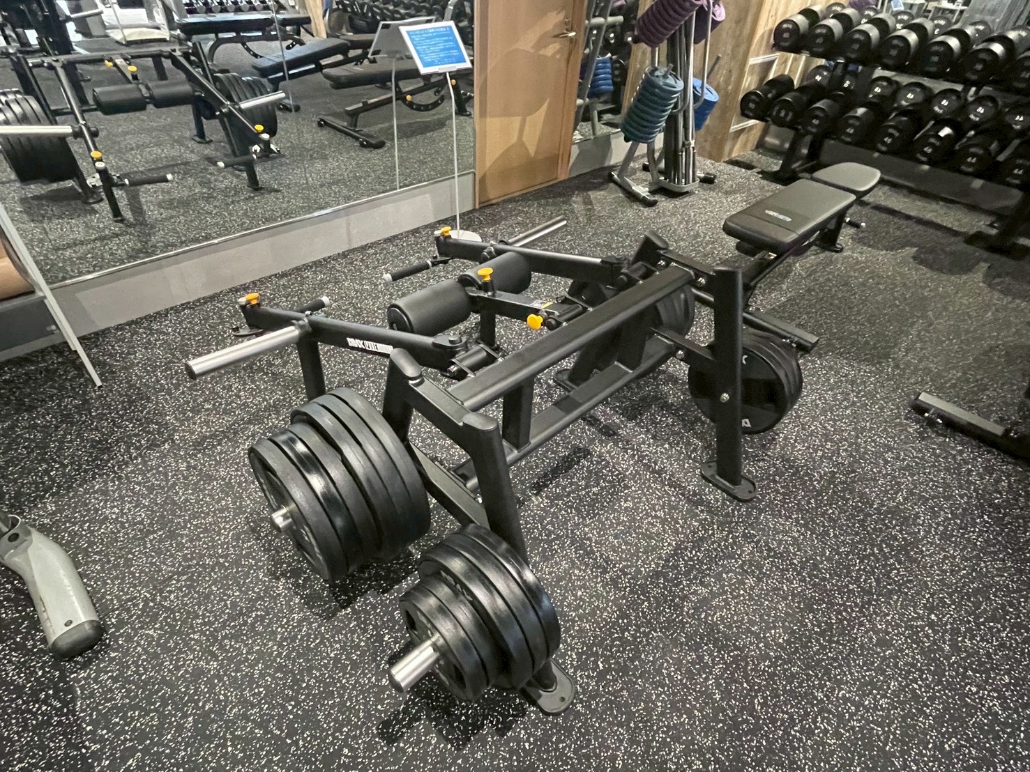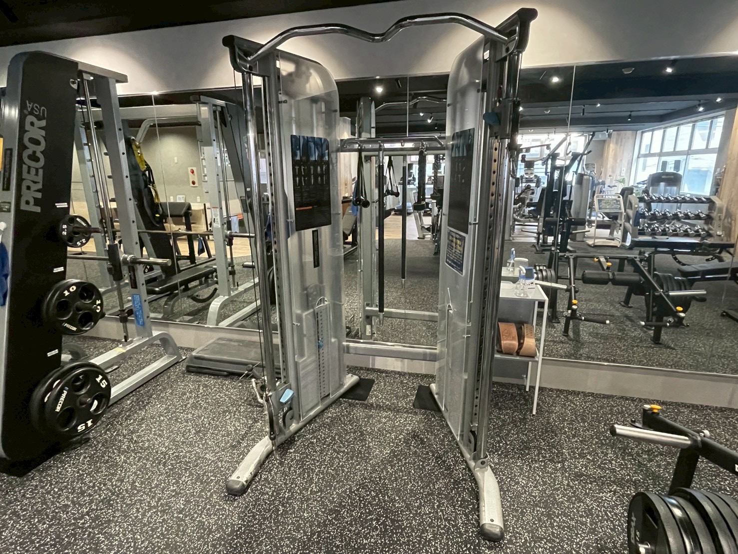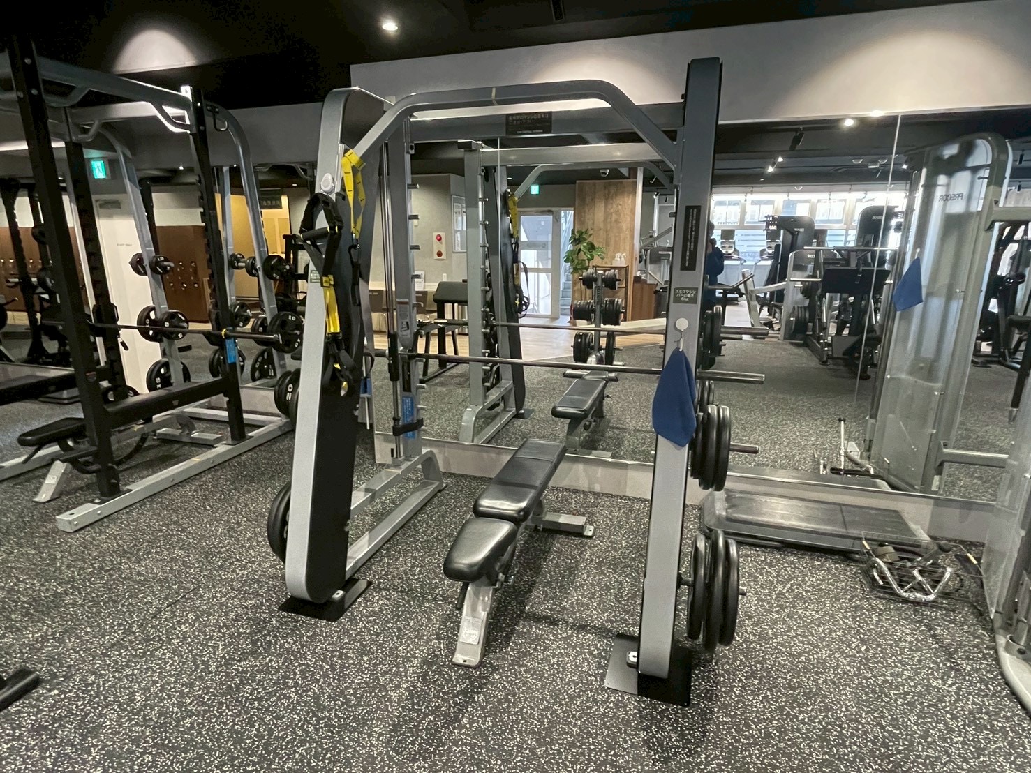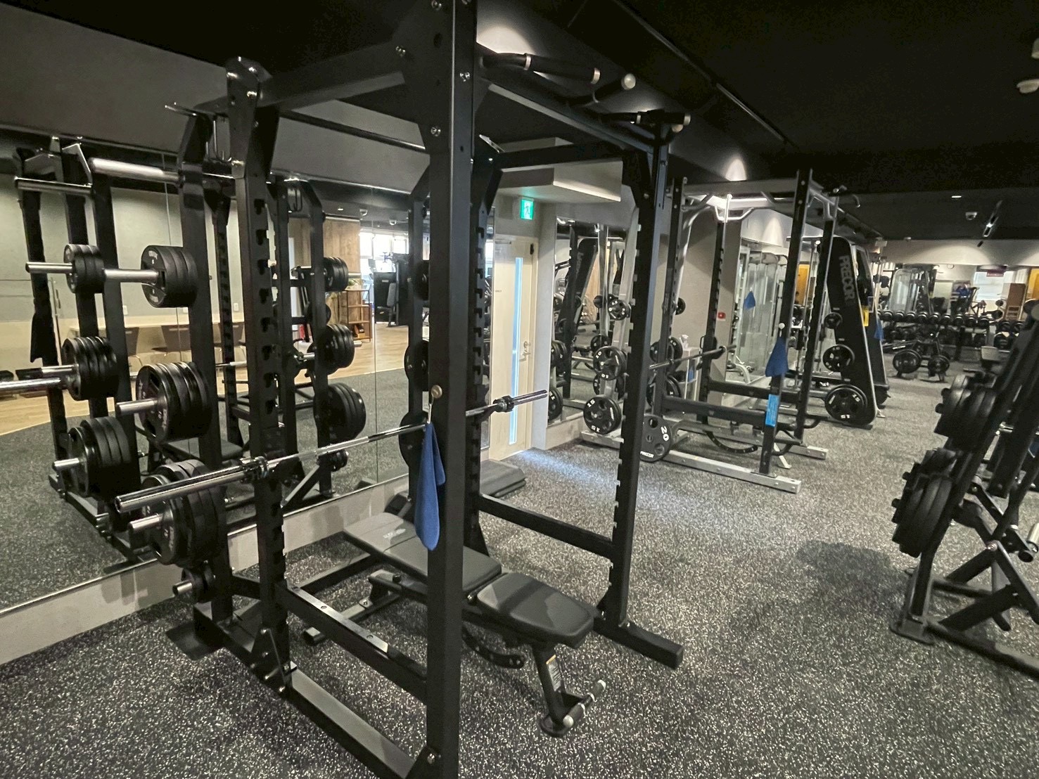 鏡に並ぶパワーラック・スミスマシン・ケーブルマシン -