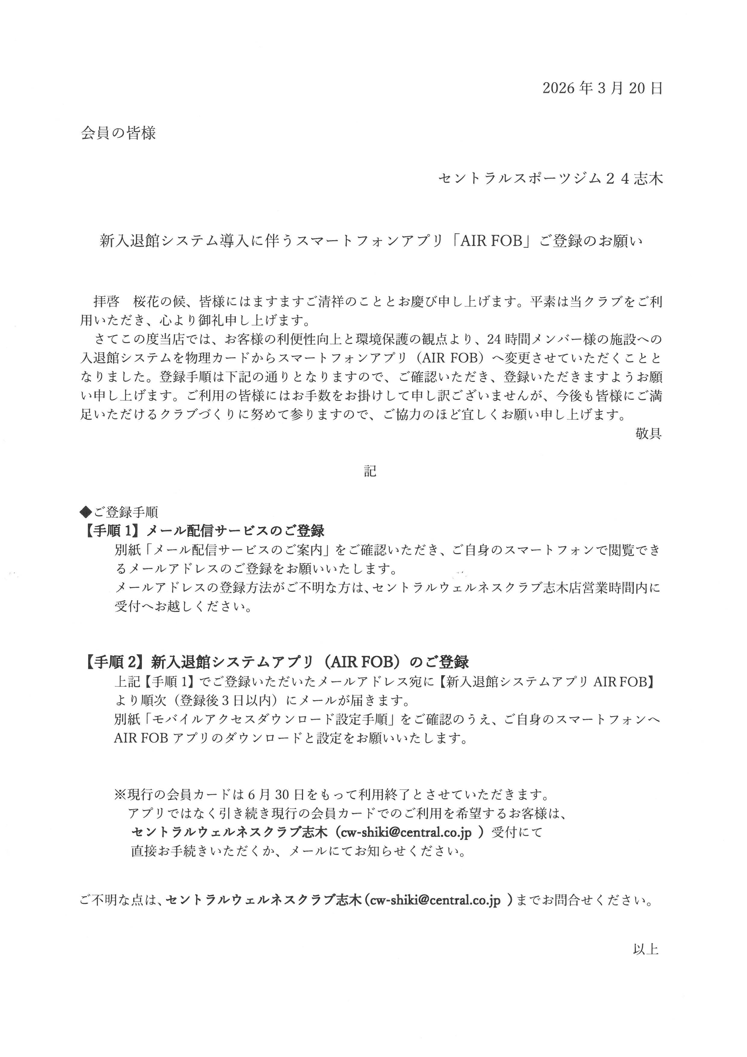 新入退館システム導入に伴うスマートフォンアプリ『AIR FOB』ご登録のお願い