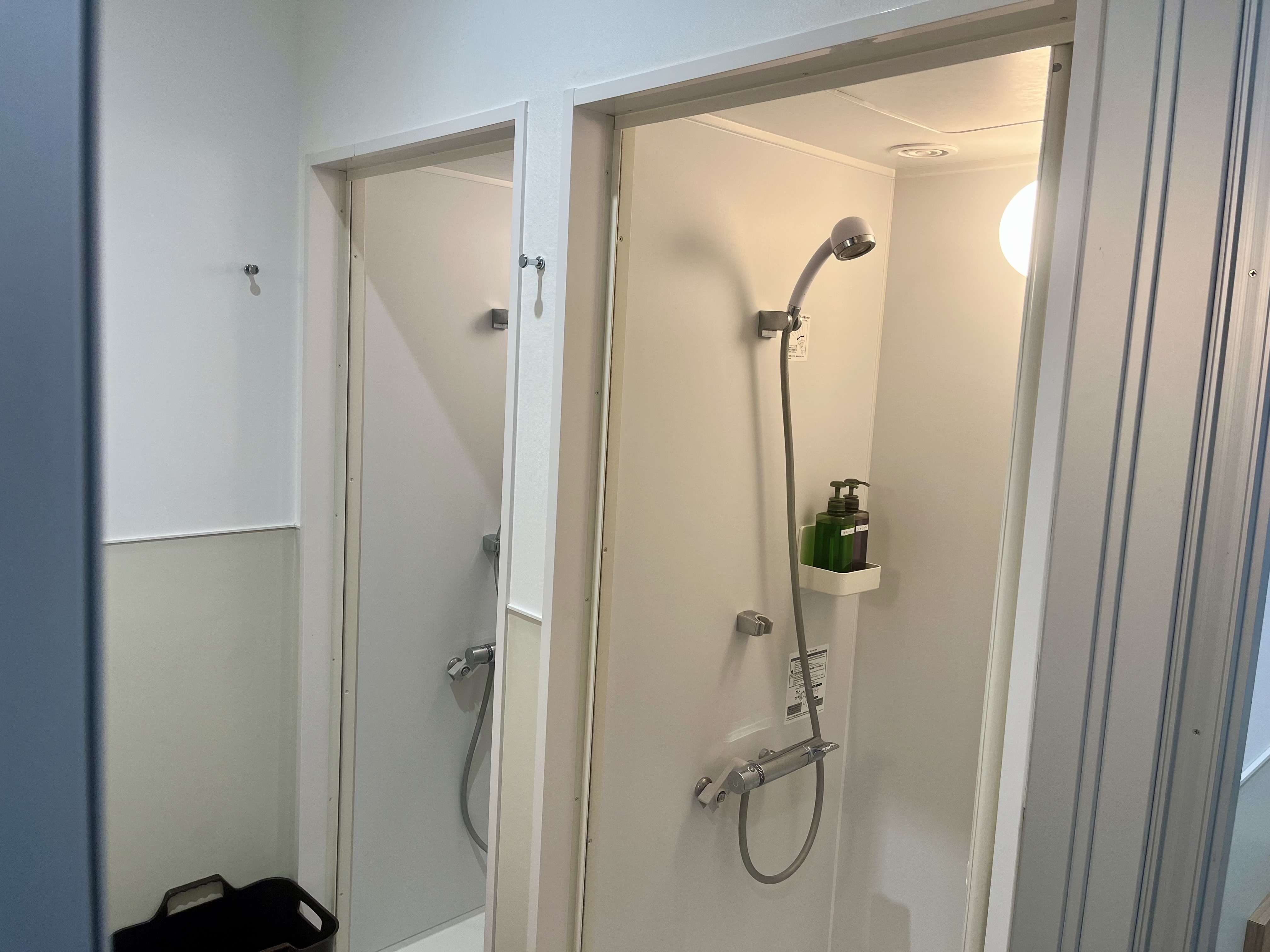 【シャワールーム】男女とも4台のシャワーブースがございます。ボディソープ・リンスインシャンプーも設置してあります。