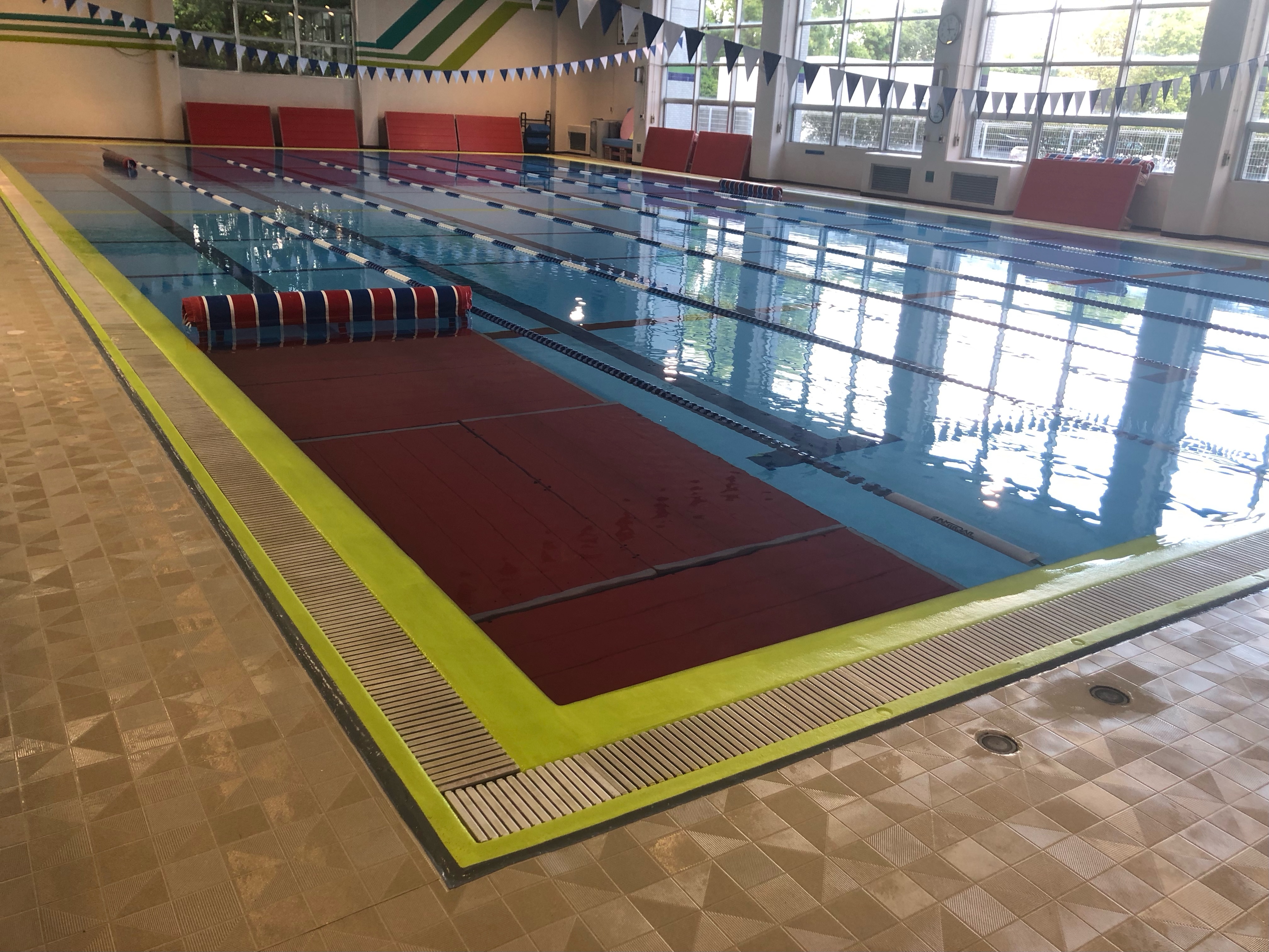 <プール>25m7コース 水深1m (幼児クラスや水慣れクラスは赤台を入れて水深60cmで実施)