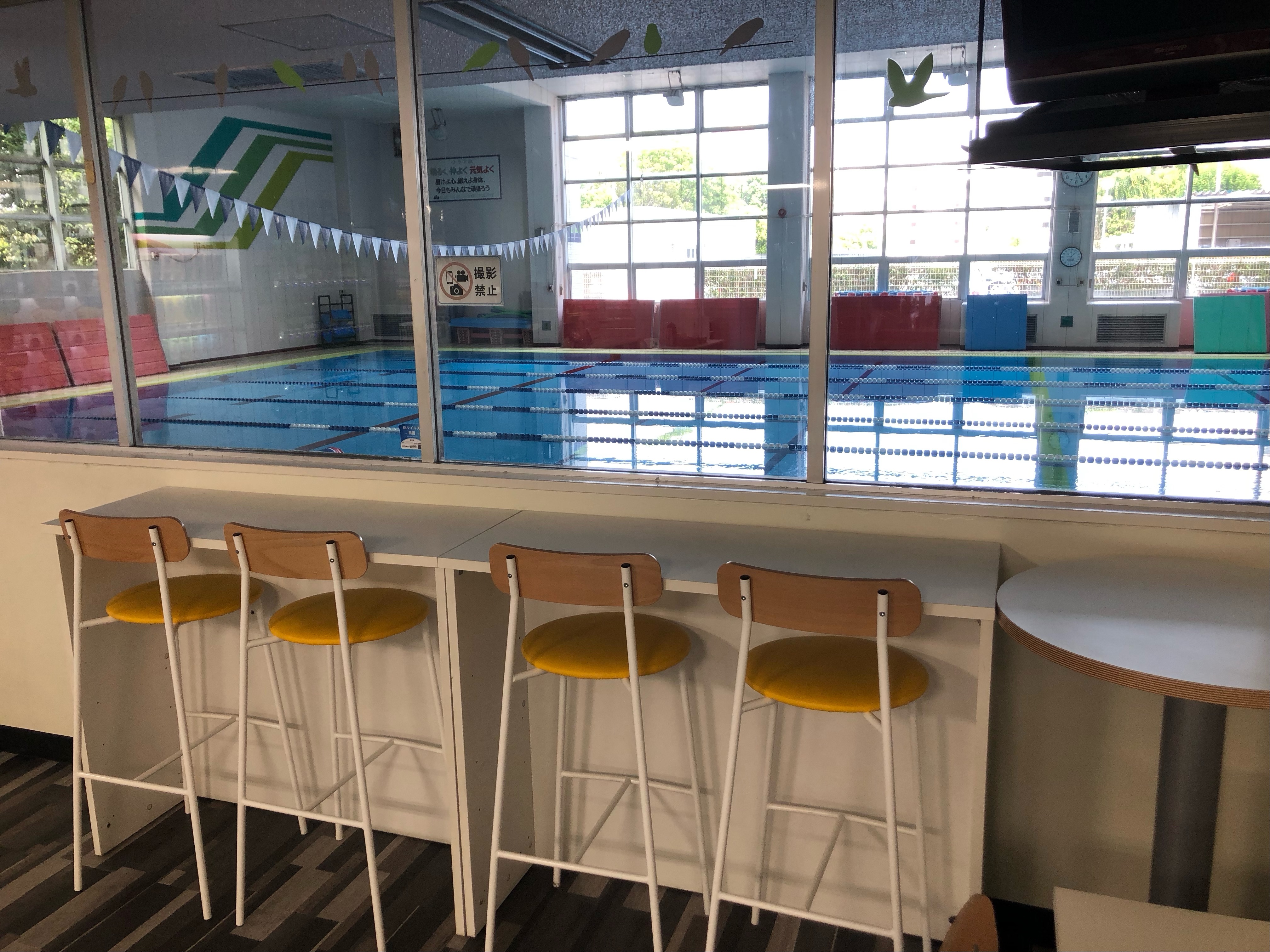 階段上がって左側がプール、右側が体育室になっており、こちらからスクールの様子をご覧い頂けます。 -