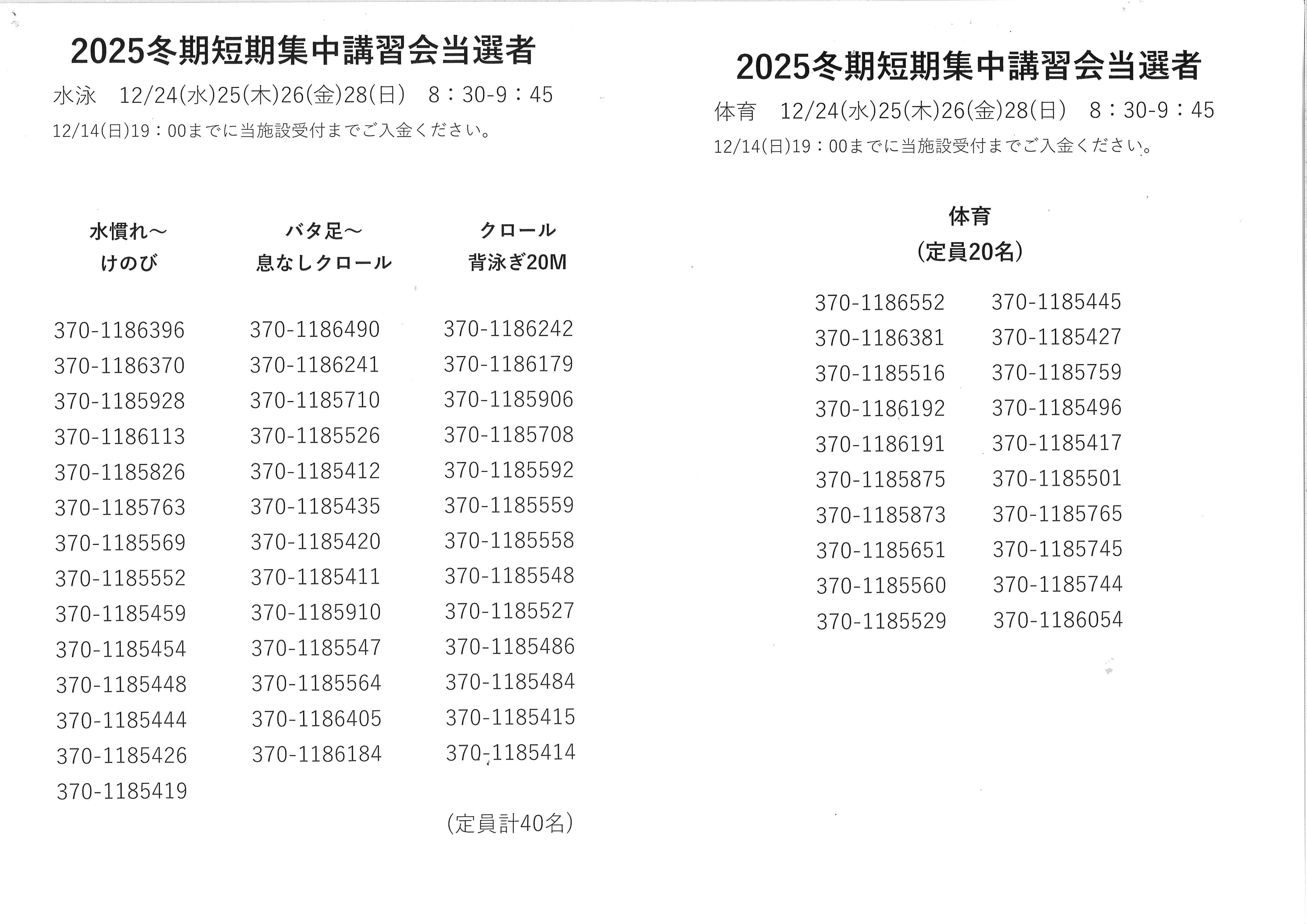 2025冬期短期集中講習会 抽選発表 12/3(水)10:30~