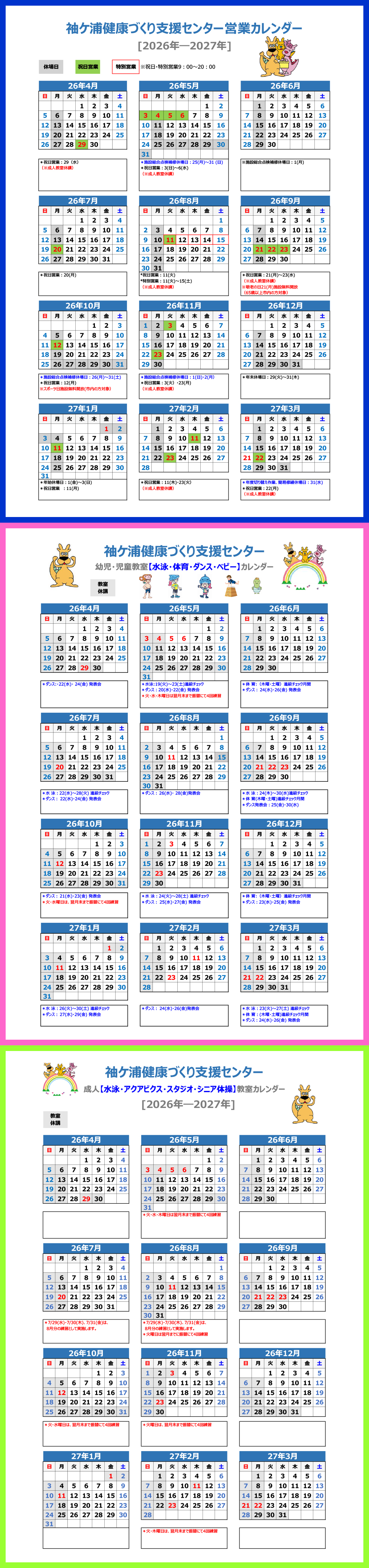 営業日、幼児・児童教室、成人教室ごとに記載が異なります。