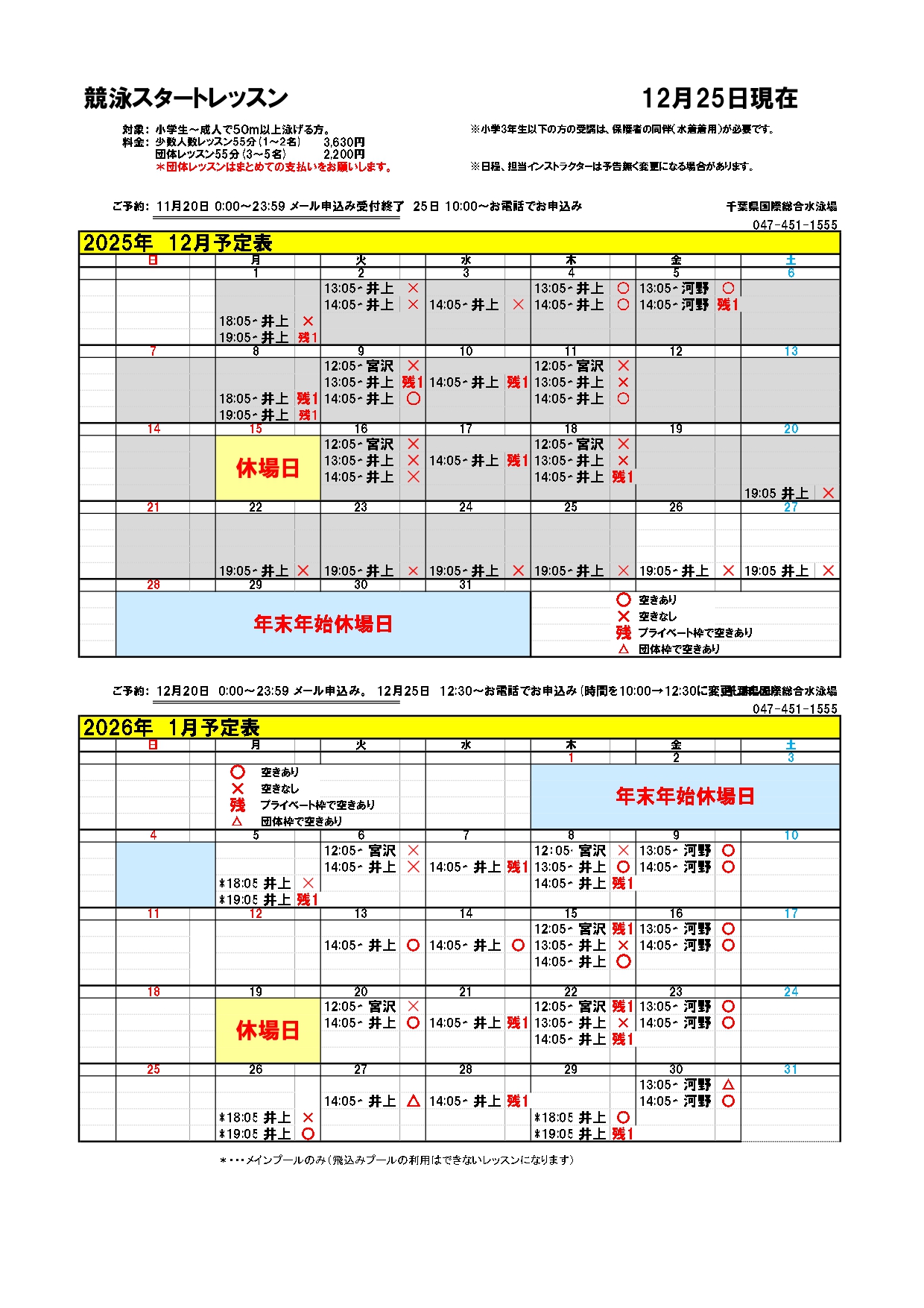12月/2026年1月 競泳スタートレッスン