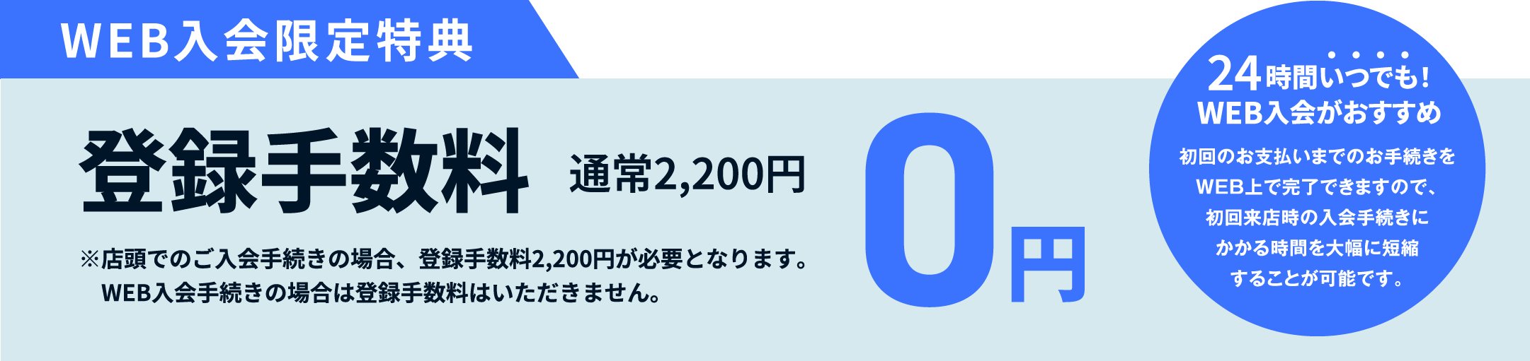 ※店頭でのご入会手続きの場合、登録手数料2,200円が必要となります。WEB入会手続きの場合は登録手数料はいただきません。