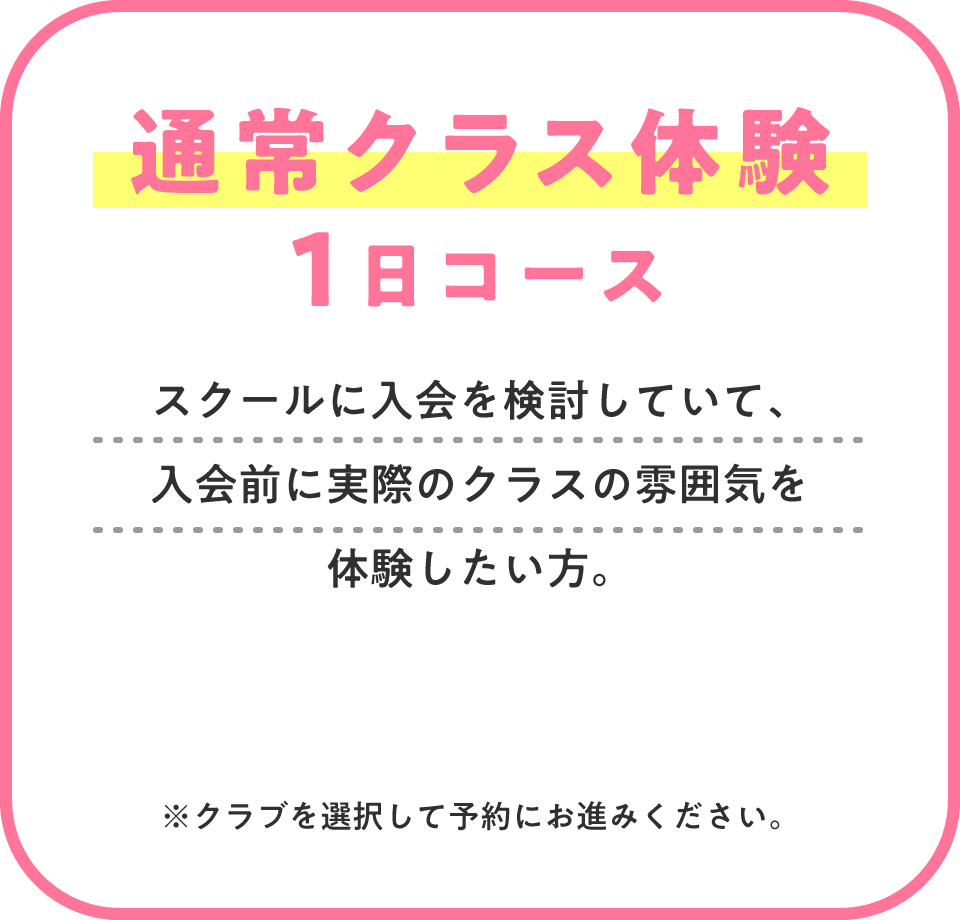 ※過去1年間在籍履歴がない方かつ最低2ヶ月間在籍を条件とさせていただきます。※特典はご入会いただいたコースの指定着となります。※クラブによって実施種目・入会特典が異なります。詳しくは店舗ホームページをご確認ください。※他のキャンペーンとの併用はできません。※退会後1年未満の再入会手続きは、カード発行手数料 無料のみ対象となります。※登録手数料は、キャンペーン対象外となります。