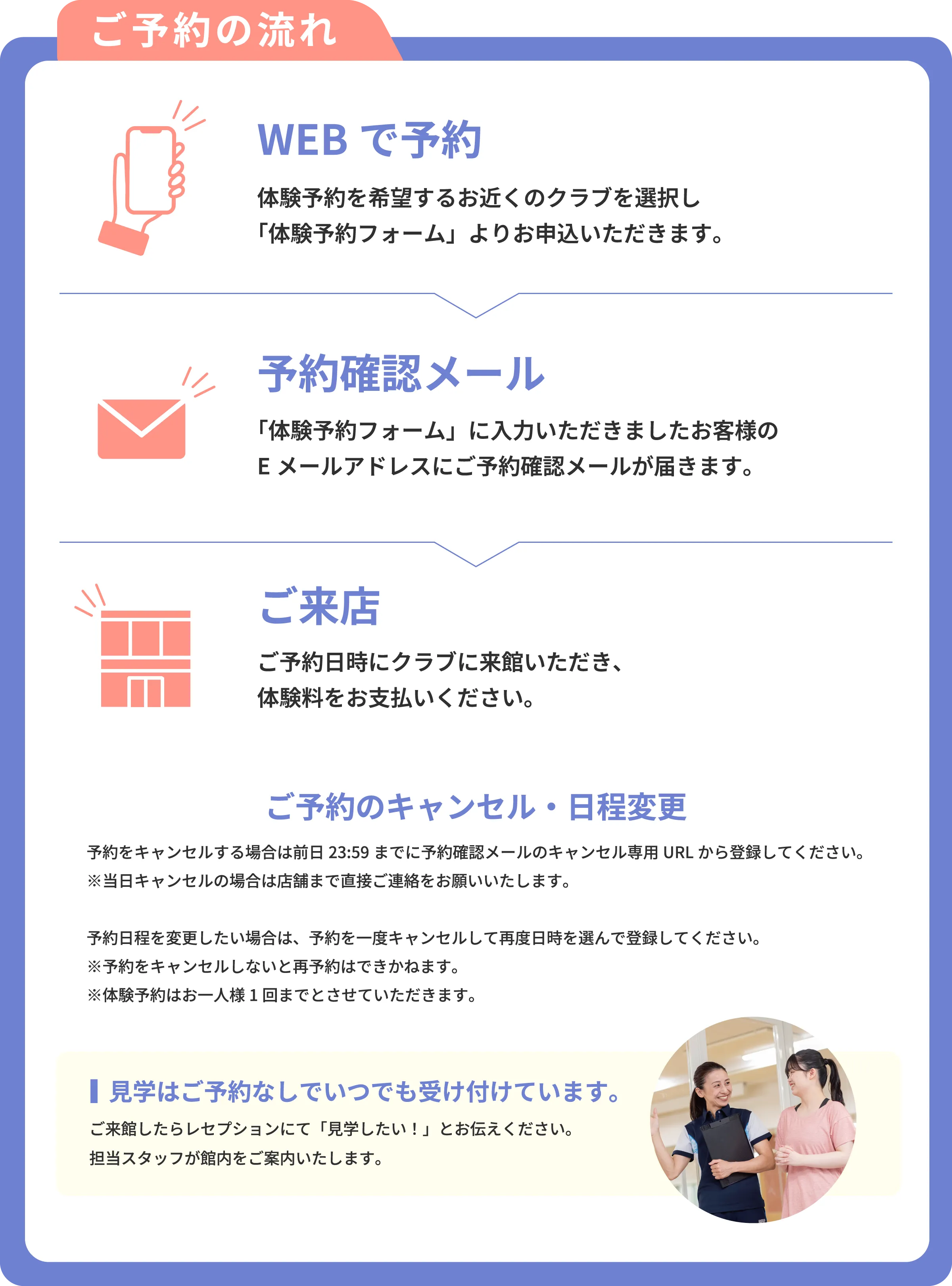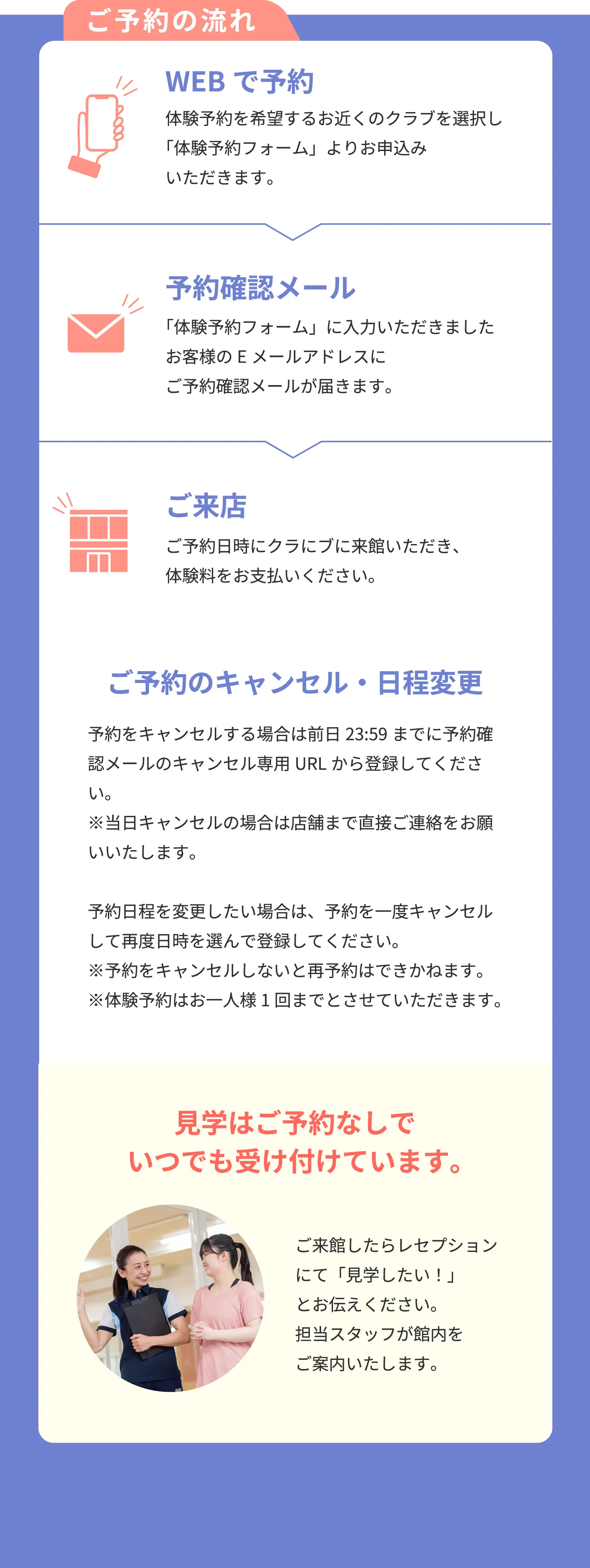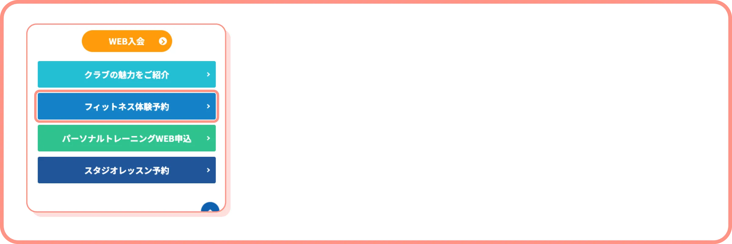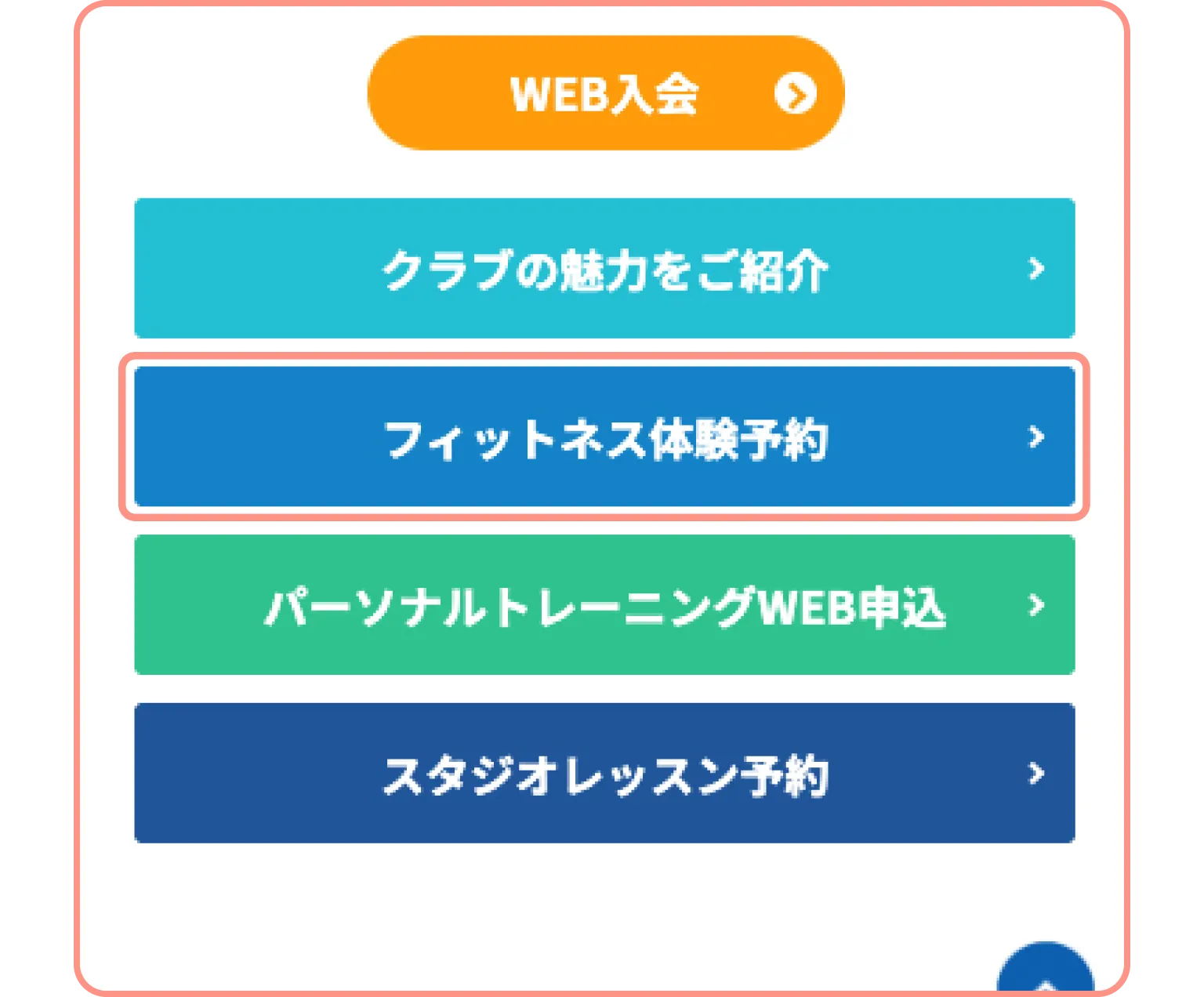 以下のボタンから体験を希望するクラブを選択し、体験前日までに体験希望クラブHPの「フィットネス体験予約」のバナーよりご予約ください。