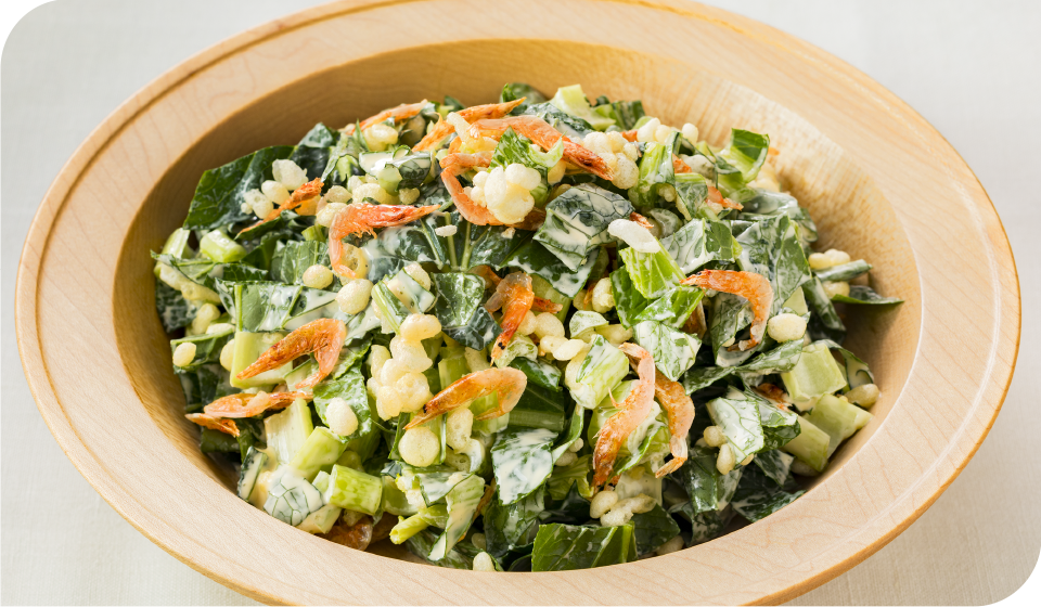 - ボウルにAを入れて混ぜ合わせ、①を加えて和える。天かすと桜えびを加えてさっと和える。