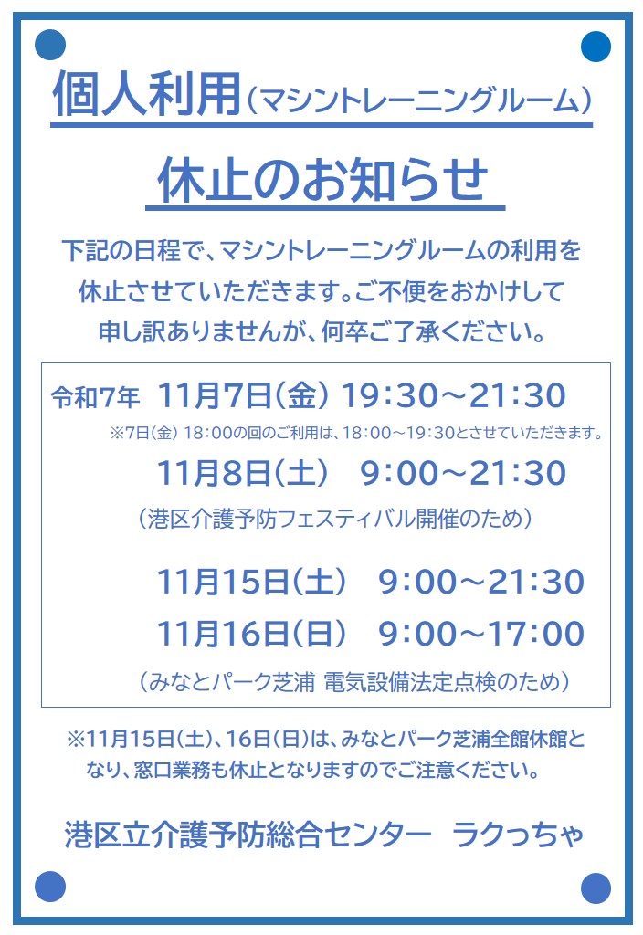 【11月】個人利用(マシントレーニングルーム)休止のお知らせ