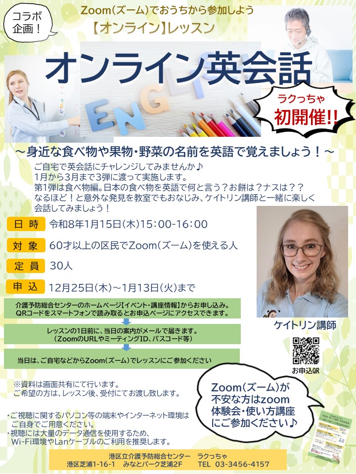 第1弾は食べ物編。日本の食べ物を英語で何と言う?お餅は?ナスは??なるほど!と意外な発見を教室でもおなじみ、ケイトリン講師と一緒に楽しく会話してみましょう!