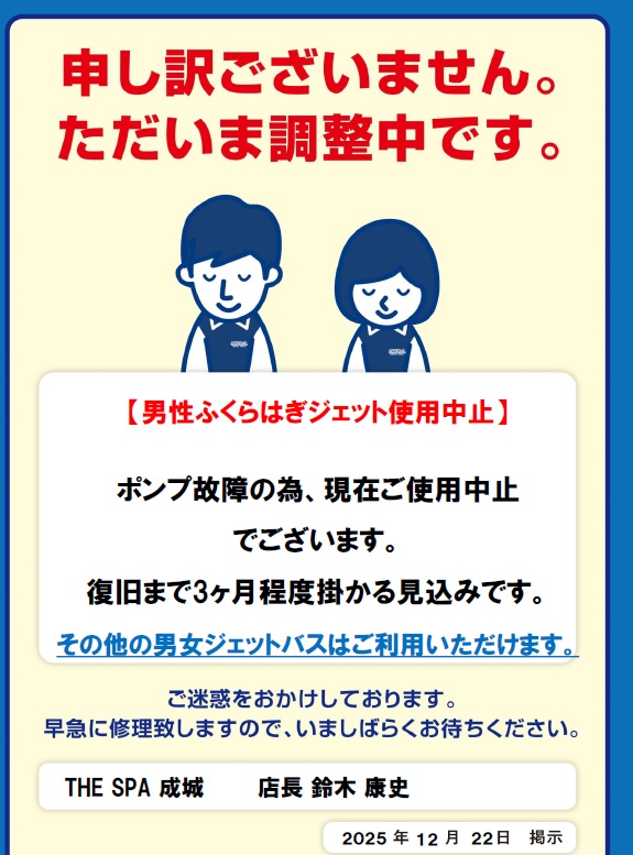男性ふくらはぎジェット使用中止のお知らせ【その他男女ジェットバスはご利用可能です】